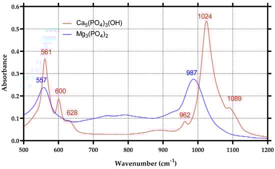 The HA has distinct absorption bands (Figure 2). The bands at 600 and 561 cm−1 are components of the PO4 ν4 vibrational mode. The 628 cm−1 vibrational band is assigned to the liberational mode of the hydroxyl group. The PO4 ν1 vibrational band is shown at 962 cm−1, and the PO4 ν3 vibrational bands are at 1089 and 1024 cm−1 [56,57,58].