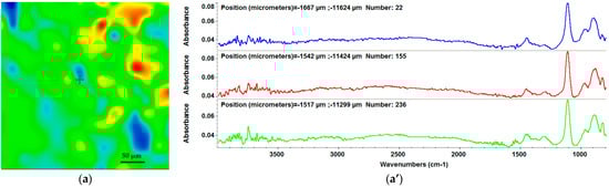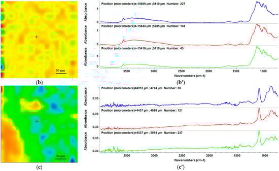 IR maps (a–c) and corresponding FT-IR spectra (a’–c’) for HA/MgP/BMP4 coatings obtained at (a) 300 mJ/cm2, (b) 400 mJ/cm2, and (c) 500 mJ/cm2.