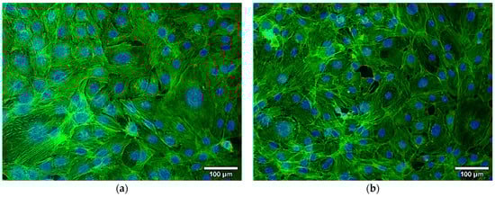 Figure 6 depicts the fluorescence microscopy images of the cells grown on the HA/MgP/BMP4 coatings labeled with phalloidin-FITC. It can be stated that the HA/MgP/BMP4 coatings did not induce any morphological changes in MC3TE-E1 osteoblasts, which exhibited normal shapes suggesting a healthy status. The osteoblast-specific architecture and high monolayer confluency could be observed on the surface of coatings, with central nuclei and elongated actin filaments.