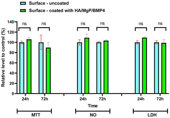 Cellular viability, NO level, and LDH release after 24 h and 72 h of MC3T3-E1 osteoblasts’ growth on the control surface and in contact with HA/MgP/BMP4 coating; ns = not significant, p > 0.05.