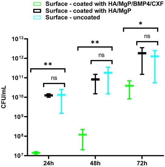 Antibiofilm efficiency assessment of the uncoated and coated surfaces against S. aureus at 24 h, 48 h, and 72 h; *—p ≤ 0.05; **—p ≤ 0.005; ns = not significant, p > 0.05.