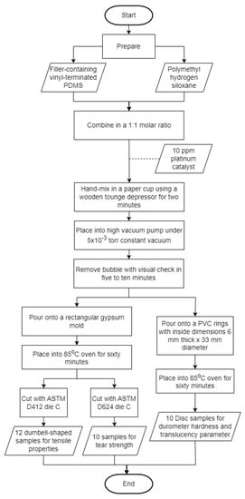 For elastomer preparation, each type of filler was sequentially added to vinyl terminated PDMS at 0%, 0.5%, 5%, 10%, and 15% by weight. A procedural flow chart is presented in Figure 1. The filler particles were first incorporated using a rotary mixer (ME 100L, Charles Ross and Son Company, Hauppauge, NY, USA) at 5000 rpm for ten minutes. For nanoparticles (KH220 and Uncoated), an ultrasonic processor (Hielscher model UP200S, Teltow, Germany) was applied for ten minutes at 105 W/cm2 to burst nanoparticle agglomerates. Each mixture was contained in a 100 mL stainless-steel cup that was cooled in an ice bath over a ten-minute period. To ensure that the nanoparticles were distributed evenly after being removed from the ultrasonic mixer, the mixture was rotary mixed once more with a Cowles disperser for 10 min at 5000 rpm. For traditional submicron particles (TS530), rotary dispersion was accomplished without ultrasonic treatment.