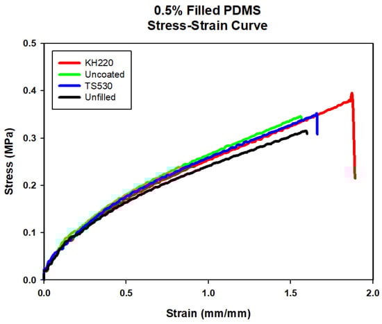 Stress–strain Curve of Unfilled and 0.5% Filled PDMS with Three Filler Types.