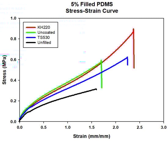 Stress–strain Curve of Unfilled and 5% Filled PDMS with Three Filler Types.