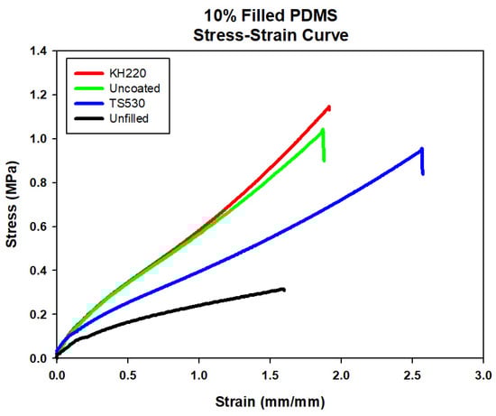 Stress–strain Curve of Unfilled and 10% Filled PDMS with Three Filler Types.