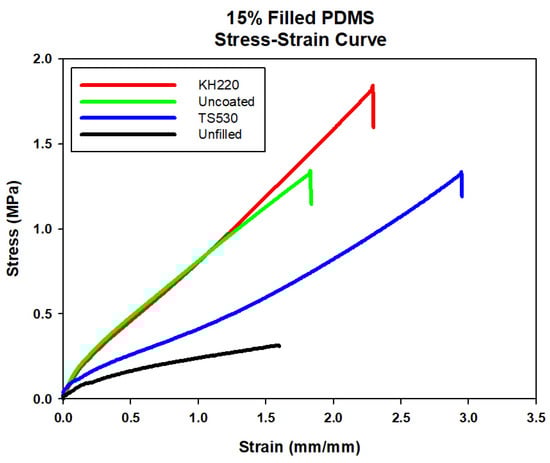 Stress–strain Curve of Unfilled and 15% Filled PDMS with Three Filler Types.