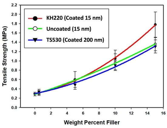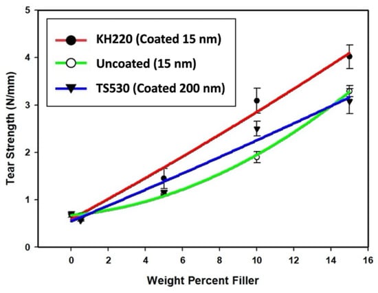 Plots of tear strength versus weight percent are presented in Figure 11. Like tensile strength, tear strength for the three filler types increased in a non-linear manner as filler content increased. No significant differences in tear strength were noted at lower filler loadings (0%, 0.5%, and 5%, p < 0.05) for the three types of filled materials. Tear strength of KH220 was significantly greater than uncoated and TS530 at 10% and 15% loadings, while tear strength of 10% filled TS530 was greater than uncoated at 10% loadings (p < 0.05), but not significantly different at 15% load levels (p ≥ 0.05). The highest tensile strength was recorded for 15% filled KH220 materials, which were 1.2 and 1.3 times higher than 15% uncoated- and TS530-filled materials, respectively. Compared to unfilled PDMS, 15% KH220-, uncoated- and TS530-filled materials were 5.8, 4.8, and 4.4 times stronger, respectively.