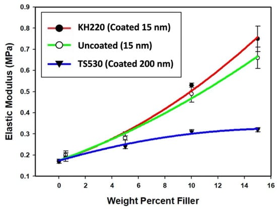 Plots of elastic modulus versus weight percent filler loading are presented in Figure 9. Results presented in Figure 9 show non-linear elastic moduli increases for KH220- and uncoated-filled materials, whereas modulus values reached a plateau at 10 weight percent filler for TS530-filled elastomers. Mean elastic modulus values among the three types of filler were not significantly different at low filler loadings (0% and 0.5%, p ≥ 0.05), but above 5%, elastic modulus, KH220- and Uncoated-filled materials were significantly greater than TS530 materials (p < 0.05). No significant differences in modulus were observed between KH220- and uncoated-filled materials until filler loadings reached 10% and 15% (p < 0.05). TS530-filled materials maintained lower elastic modulus values throughout all filler loading increases. At 5% loading, TS530-filled samples produced 1.3 times lower elastic modulus than both KH220- and uncoated-filled samples and the gap widened at higher filler loadings. The highest mean elastic modulus was recorded for 15% KH220-filled materials, which were 1.5 times higher than uncoated-filled materials and 2.5 times higher than TS530-filled materials. KH220-, uncoated- and TS530-filled materials at 15% loading were 4.0, 3.5, and 1.7 times stiffer than unfilled PDMS, respectively.