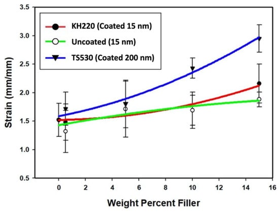 There were no significant differences of failure strain at lower filler loadings (0%, 0.5%, and 5%, p < 0.05) for the three filler types, except between 0.5% uncoated- and TS530-filled materials (p < 0.05). Failure strain of TS530-filled materials were significantly greater compared to KH220- and uncoated-filled materials for 10% and 15% filler loadings, while failure strain for 15% of KH220-filled materials were significantly greater than uncoated-filled materials (p < 0.05). The highest failure strain among all groups was for 15% TS530 filler, which was 1.4 times higher than 15% KH220-filled materials and 1.6 times higher than uncoated-filled materials. 15% filled KH220-, uncoated- and TS530-materials produced 2-, 1.4-, and 1.2-times strain to failure compared to unfilled PDMS, respectively.