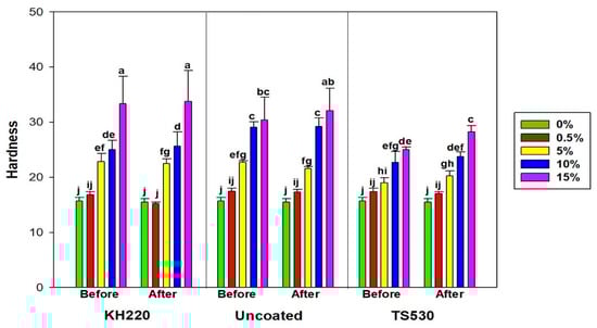 Bar graphs displaying means and error bars representing standard errors of means for Durometer Hardness for Indoor samples before and after 3000 h of storage. Lower case letters denote statistical groupings. Groups with means having the same lower-case letters are not significantly different (p > 0.05, ANOVA/Tukey). Comparisons are both within and across materials.