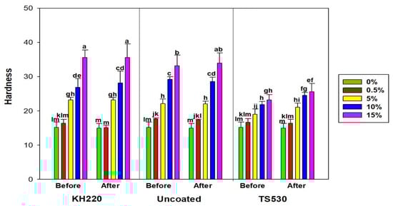 Effects of outdoor weathering are shown in Figure 15. All filler types experienced significant decreases in translucency parameter for 0% and 0.5% filler content, which ranged from 50.91 to 45.03 and 44.96 to 39.24, respectively (p < 0.05). Highly filled materials (10%, 15%) maintained translucency after outdoor weathering, with nanofilled materials possessing translucency parameter values 18 to 20 units lower than TS530-containing materials. From visual observation of the samples, lower filler loadings produced color changes that were darker and more opaque following 3000 h of outdoor weathering, whereas undetectable color changes were observed in higher filled samples.