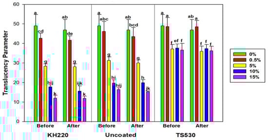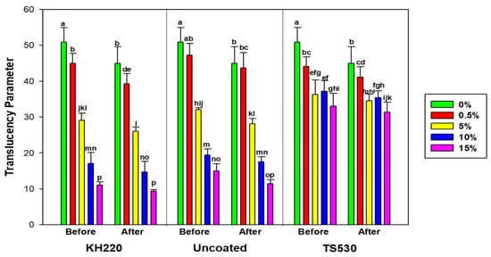 Bar graph displaying means and error bars representing standard error of Translucency Parameter for Indoor samples before and after 3000 h of storage. Lower case letters denote statistical groupings. Groups with means having the same lower-case letters are not significantly different (p > 0.05, ANOVA/Tukey). Comparisons are both within and across materials.