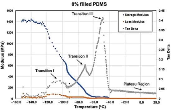 Storage Modulus, Loss Modulus, And Tan Delta Curves For 0% Filled PDMS From −150 °C To +20 °C. (Transition I not labeled).
