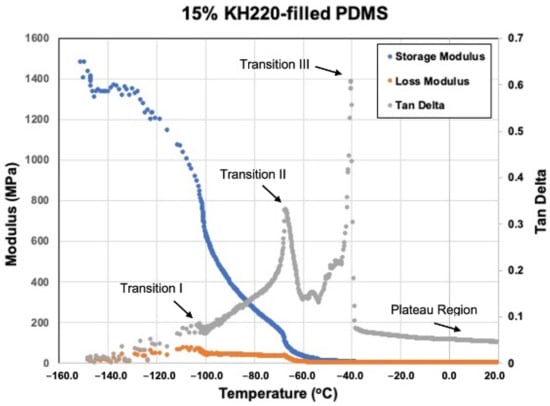 At −150 °C PDMS behaves as a glass, where polymer molecules are well anchored by hydrogen bonding and low thermal disturbance. This produces high values for storage modulus and low values for loss modulus, rendering the deformation response as elastic in nature. Temperature increases to Transition I decrease storage moduli and increase loss moduli for all formulations, including unfilled (Figure 16, Figure 17, Figure 18 and Figure 19). These moduli changes reflect a decrease in stiffness and increase in damping, which increases tan delta and appears as a spike on the graphs. At this temperature, the polymer is undergoing devitrification and reforming crystallites that were generated during cooling to −150 °C. A comparison of Transition I temperatures presented in Figure 16, Figure 17, Figure 18 and Figure 19 and Table 2 demonstrate approximately 4 °C higher transition temperatures for 15%-filled formulations compared to unfilled PDMS. Since increasing temperatures are causing polymer chains to fold and align into crystallites, materials with more crystals require more thermal energy and hence higher temperatures. This also can be understood by viewing the reverse process, where materials with higher filler numbers more effectively nucleate crystals during cooling to −150 °C. Transition I temperatures occur earlier, at higher temperatures. Temperature transition trends appearing in Table 3 also show for 5% and higher filled materials that KH220-filled PDMS consistently demonstrates higher transition temperatures than do uncoated- and TS530-filled PDMS. This is consistent with higher crystal numbers created by superhydrophobically coated particles promoting superior filler dispersion, where more nucleation sites are available.