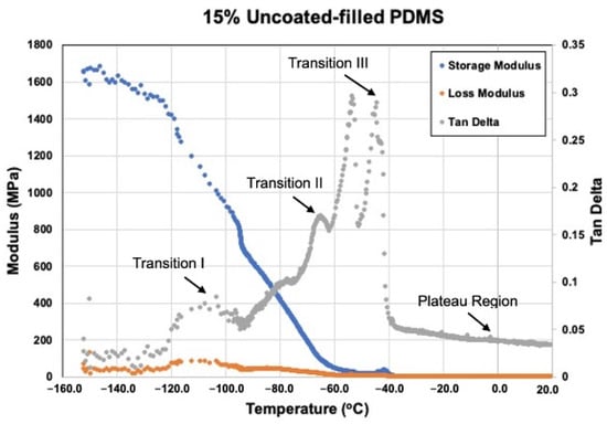 Figure 16, Figure 17, Figure 18 and Figure 19 show storage modulus (E′), loss modulus (E″) and tan delta curves from unfilled, 15% coated nanosilica-, 15% uncoated nanosilica-, and 15% submicron silica-filled PDMS, respectively. A single peak was observed in E″ and in tan delta, along with a drop of E’, in all samples in the temperature region of the first glass transition, occurring between −110 to −95 °C (Transition I). At higher temperatures, −95 to −40 °C, E′ and E″ decreased gradually, with E′ in 15% coated nanosilica-filled PDMS observed to have steeper curves compared to other groups. Additional tan delta peaks were observed at temperatures near −70 °C (Transition II) and −40 °C (Transition III). A rubbery plateau region was observed between −40 °C and +20 °C for all samples.