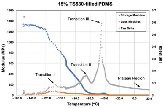 Storage Modulus, Loss Modulus, And Tan Delta Curves For 15% TS530-filled PDMS From −150 °C To +20 °C.
