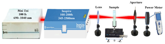 The Z-scan setup [31] is depicted in Figure 2. The AgNP colloidal samples were subjected to an intense tunable pulsed femtosecond laser (INSPIRES HF100) from spectra physics (Mountain View, CA, USA). With a repetition rate of 80 MHz, this system can cover a wavelength range from 345 to 2500 nm. The used femtosecond laser was pumped by a mode-locked femtosecond Ti: Sapphire laser (MAI-TAI HP) from spectra physics, which has a wavelength range from 690 nm to 1040 nm and a repetition rate of 80 MHz. The spatial profile of the pulsed laser beam is Gaussian, with a spatial mode of TEM00 and an M2 factor < 1.1. Using horizontally polarized laser pulses with a 100 fs duration, the nonlinear optical response of AgNPs colloids was examined. A quartz cuvette glass (from Hellma Analytics, Plainview, NY, USA) with a 1 mm optical path was employed to fill with AgNPs colloids. The input Gaussian laser beam was focused using a convex lens with a 5 cm focal length to a beam waist of 17.2 μm, which was measured by the knife-edge method. The total transmitted intensity from the sample is measured as a function of sample location relative to the focus using the optical power meter (Newport 843–R). The transmittance “S” of the aperture is adjusted to be S = 0.3 and S = 1 correspondingly for both closed aperture (CA) as well as open aperture (OA) measurements.