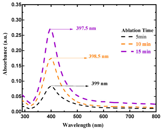 UV–Vis absorbance spectra of AgNP colloids at constant ablation energy of 100 mJ/pulse and at different ablation times.