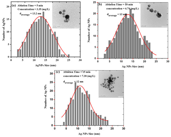Size distribution of AgNPs synthesized at various ablation times. Insets show TEM images of AgNPs. (a) 5 min laser ablation time (b) 10 min laser ablation time (c) 15 min laser ablation time.