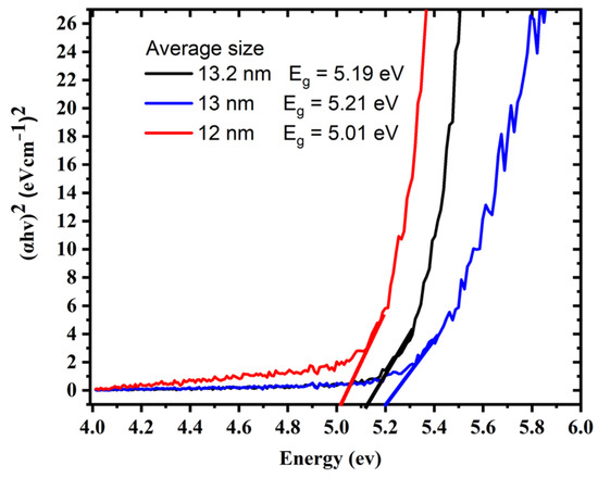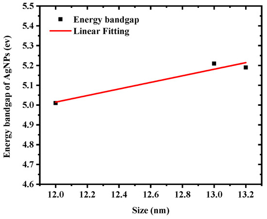 One of the most effective approaches for determining the optical response of metallic nanoparticles is UV–Vis spectroscopy. The UV–Vis absorption spectra of silver colloids were measured by a spectrophotometer (Model: Branson UV-1510, wavelength accuracy 0.1 nm, Branson Ultrasonics Corp., Danbury, CT, USA). This technique is useful due to colloidal metal nanoparticles’ high surface plasmon resonances [32]. The sharp SPR peak around the 400 nm region corresponds to colloidal AgNPs [33,34]. Several factors can influence the SPR peak position, such as the shape, size, and concentration of AgNPs. Figure 3 illustrates UV–Vis absorption spectra of colloidal AgNPs obtained at different ablation periods of 5, 10, and 15 min with a 100 mJ/pulse ablation energy. The SPR peaks for samples prepared for 5, 10, and 15 min were found at 399, 398.5, and 397.5 nm, respectively. The shift of the peak position toward a shorter wavelength with increasing laser ablation time can be attributed to the synthesis of smaller particle sizes with increasing laser ablation time. It was also found that as ablation time increased, the SPR peaks became sharper as in the case of 15 min ablation time. The FWHMs of SPR peaks were 86.56, 69.85, and 68.34 nm for 5, 10, and 15 min ablation times, respectively. This decrease in the FWHM of the peak can be due to the reduction in the particle size distribution with increasing laser ablation time. The average size and size distribution of AgNPs were verified using a transmission electron microscope (TEM). Figure 4a–c depict the histogram of the size distribution of AgNPs produced by ablation with a laser in distilled water at various ablation times. The inset in Figure 4 shows the TEM micrographs of the AgNPs, which shows that AgNPs are mostly spherical with an average size of 12–13.2 nm. When the laser ablation time was increased from 5 to 15 min, the size of the AgNPs decreased from 13.2 nm to 12 nm. The laser fragmentation of AgNPs could explain the decreases in NP size with increasing ablation time [35]. When the ablation time was increased, the already synthesized AgNPs were fragmented into smaller NPs, resulting in increased concentration of AgNPs. Figure 5 displays the Tauc’s plot of AgNP colloids at various ablation times. The optical bandgap () measurements for the AgNP colloids are obtained using Tauc’s equation for the direct bandgap of () [36], where A is the proportionality constant, is the energy bandgap, is the absorption coefficient, and is the incident photon energy. The direct bandgap was investigated by extrapolating the straight line of Tauc’s plot () as shown in Figure 5. The relation between the energy bandgap and size of AgNP colloids is depicted in Figure 6. The bandgap energy increases as the size of AgNPs increases. Using an atomic absorption spectrometer, the concentration of AgNP colloids was measured at different ablation times (Agilent Technologies, Santa Clara, CA, USA, 200 Series AA). Figure 7 shows how the size and concentration of AgNPs are directly proportional to the ablation time. As ablation time increases, the size of AgNPs decreases, while concentration increases.