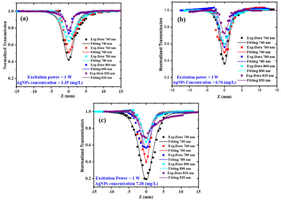CA Z–scan transmission for AgNPs at 1 W excitation power, different excitation wavelengths between 740 and 820 nm, and various AgNP concentrations of (a) 3.35 (mg/L), (b) 6.74 (mg/L), and (c) 7.38 (mg/L).