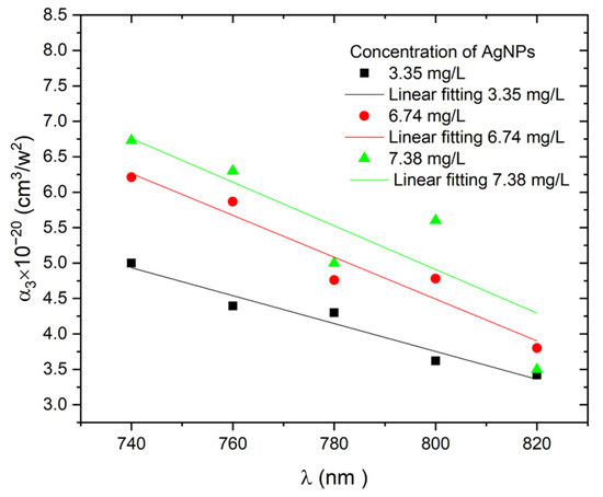 where ΔTOA is an expression for normalized transmission, α3 is the three-photon nonlinear absorption coefficient, I0 is the maximal intensity at the focus (Z = 0), and L and Z0 are the sample thickness and Rayleigh length, respectively. The obtained value of α3 at various concentrations of AgNP colloids as a function of excitation wavelengths is shown in Figure 9. As the excitation wavelength decreases from 820 to 740 nm, the α3 increases, which could be attributed to increased free-carrier absorption [43].