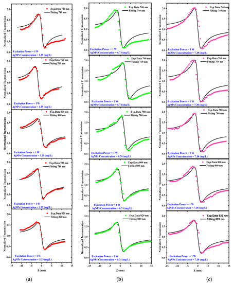 The CA Z-scans for different concentrations of 3.35, 6.74, and 7.38 mg/L are shown in Figure 10a–c, respectively. The solid black curves in Figure 10 were fitted to experimental data with L = 1 mm, EP = 12.5 nJ, fL = 80 MHz, and NP = 19.2 × 109 pulses using Equations (2) and (3). Changing only parameter in Equation (2), which is material dependent, obtained the best fit to the closed aperture experimental data. The results show that transmissions have a prefocal peak followed by a postfocal valley, regardless of concentrations. This result suggests that AgNPs have a negative nonlinear refractive index. These findings are consistent with previously reported literature [50]. Furthermore, the CA experimental results show that increasing the excitation wavelength causes a decrease in the normalized transmittance peak-to-valley difference ΔTP-V.