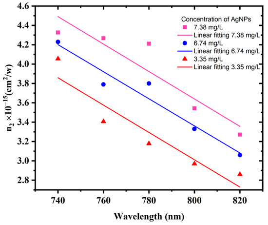 At various AgNP concentrations, Figure 11 depicts the nonlinear refractive index n2 as a function of the laser excitation wavelength. Figure 11 shows that, due to the influence of SPR, the n2 linearly decreases as the laser excitation wavelength increases for all AgNP colloid samples. The nonlinear refractive index decreases as the excitation wavelength is far from the SPR [51]. Furthermore, as the AgNP concentrations increase, n2 increases, which is owing to the AgNP size decreasing.