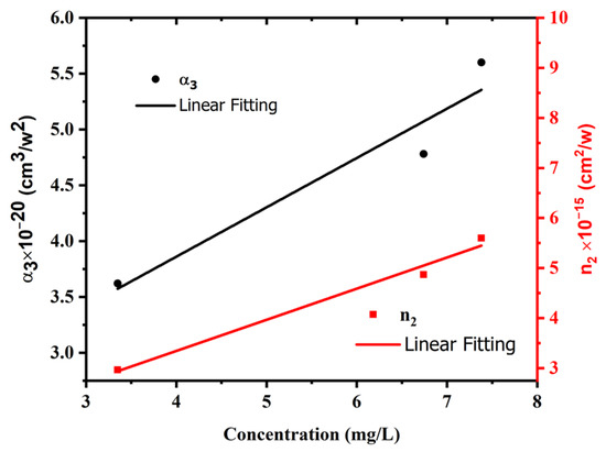 Dependence of α3 and n2 on AgNP colloid concentration at constant excitation power and wavelength of 1 W and 800 nm, respectively.