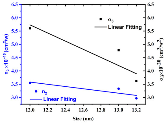 Dependence of n2 and α3 on average particle size at constant excitation power and wavelength of 1 W and 800 nm, respectively.