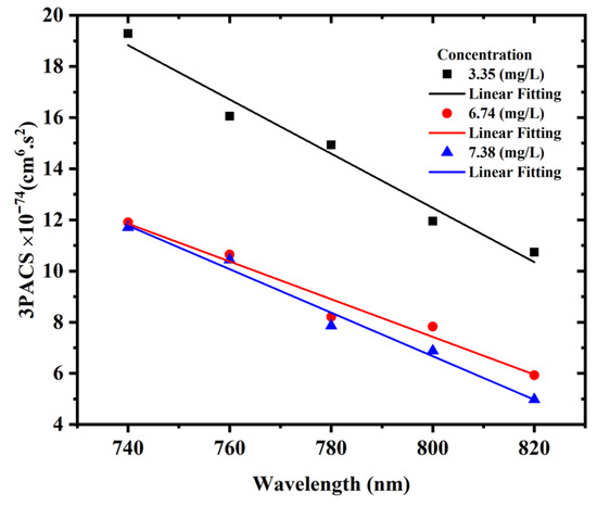 where NA stands for Avogadro’s constant, (mol/L) is the concentration, and is the photon energy. Figure 14 illustrates the dependence of the three-photon absorption cross-section on the excitation wavelength when the excitation power was kept constant at 1 W. With increasing excitation wavelength, the three-photon absorption cross-section decreases. This is because when the excitation wavelength decreases, the free carrier absorption increases, resulting in an increase in the three-photon absorption cross-section. Moreover, a decrease in 3PACS was also observed with the increasing concentration of the AgNPs due to particle agglomeration.