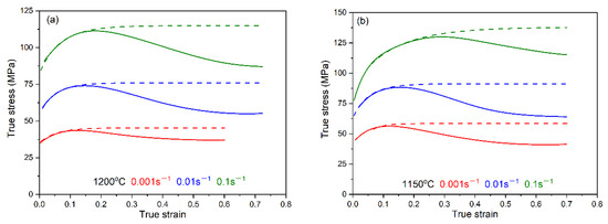 The experimental flow stress curve can be predicted through incorporation between the DRV curve and DRX softening. By substituting Equations (19) and (21) into Equation (18), the flow stress–strain curve of high-grade pipeline steel can be obtained as follows: