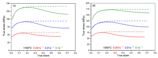 Figure 2a–c are the prediction results, and it can be seen that the calculated flow stress curve of DRV at all deformation conditions coincide well with the experimental flow stress–strain curves before the critical stress/strain. After the critical stress/strain, the flow stress of DRV keeps increasing until it reaches the saturation stress (σsat). On the whole, the flow stress–strain curve of DRV increases with the decrease in temperature or the increase in strain rate.