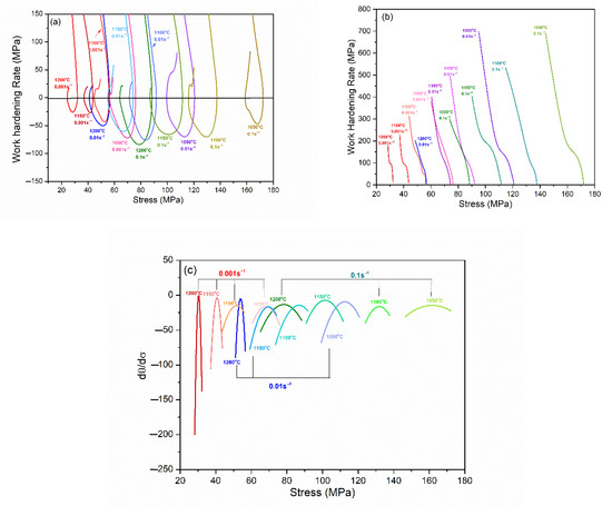 Usually, the characteristic stress of DRX softening curve can be obtained based on the working hardening rate (θ = dσ/dε) curve, including the critical stress (σc), the peak stress (σp), the maximum softening stress (σm), and the steady state stress (σss) [22]. A typical total θ-σ curve of X70 pipeline steel is shown in Figure 3a, where, σp, σm, and σss can be easily obtained. In order to determine the critical stress (σc) for the onset of DRX, Poliak and Jonas [26] proposed the double-differentiation method. Firstly, the local flow stress–strain curves from the yield stress (σ0) to the peak stress (σp) were fitted using the seventh order polynomial. The working hardening rate curves under different deformation conditions are shown in Figure 3b. Then, when the derivative of the work-hardening rate curve is equal to 0, the critical stress (σc) is obtained under different deformation conditions, as shown in Figure 3c. All characteristic strains of DRX can be obtained from corresponding characteristic stresses in the flow stress curve.