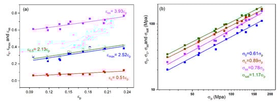 Since the peak stress/strain can be directly and accurately obtained from the experimental flow stress curve, the empirical relationship between the peak stress/strain and other characteristic stress/strain is often established. It can be seen from Figure 4a that the yield strain/stress, the critical stress/strain, the maximum softening stress/strain, and the steady state stress/strain show a good linear relationship with the peak strain, in which their empirical relationship can simply expressed as: εc = 0.51εp, εmax = 2.52εp, and εss = 3.93εp. Similarly, characteristic stresses are in a certain proportion to the peak stress (Figure 4b), which can be expressed as: σc = 0.89σp, σ0 = 0.61σp, σss = 0.78σp, and σsat = 1.17σp, respectively.
