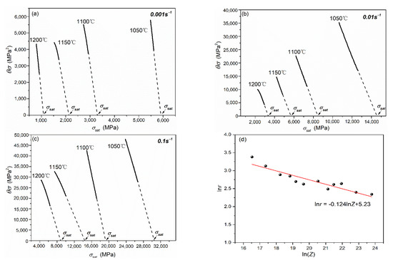 The plot of σ2 vs. θσ of the X70 pipeline steel at different deformation conditions: 0.001 s−1 (a); 0.01 s−1 (b); 0.1 s−1 (c); and the relationship between parameter r and Z parameter in the X70 pipeline steel (d).