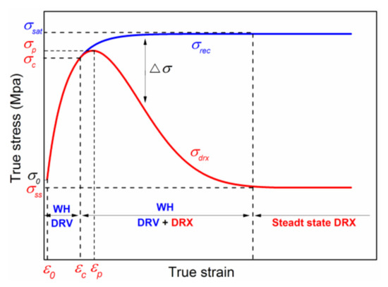 Figure 7 is a schematic diagram of the dynamic softening of flow stress at elevated temperature. After the critical stress, the flow stress presents two different characteristics represented by the “blue” and “read” lines in Figure 7, which are attributed to DRV and DRX, respectively. For the “blue” curve, when the work-hardening rate is equal to the DRV softening rate, the stress reaches saturation value and remains constant (σsat). For the “red” curve, after the flow stress reaches the peak stress, the DRX softening rate is stronger than the work-hardening rate resulting in the flow decreasing continuously to the steady state value (σss). Therefore, using the difference between the experimental stress curve and the flow stress of DRV, the volume fraction of the DRX can be expressed as: