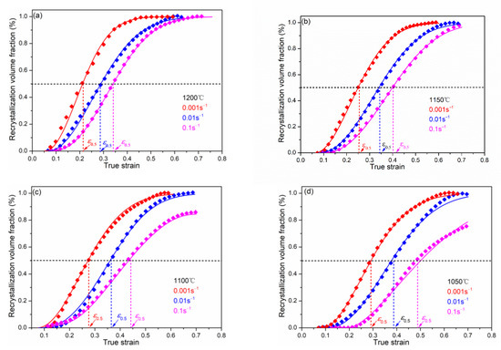 Comparison between the experimentally (symbols) and predicted (solid curves) volume fraction of DRX: (a) 1200 °C, (b) 1150 °C, (c) 1100 °C, (d) 1050 °C.