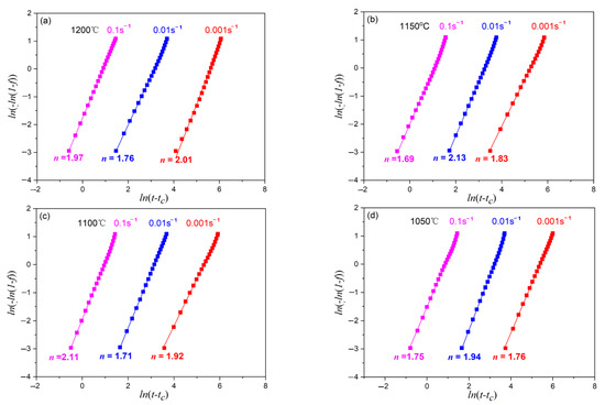 Value of Avrami index (n) at different deformation conditions. (a) 1200 °C; (b) 1150 °C; (c) 1100 °C; (d) 1050 °C.