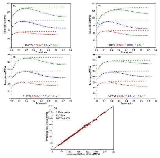 Comparison between the predicted and experimental flow stress–strain curves from constitutive equation at strain rate (a) 1200 °C, (b) 1150 °C, (c) 1100 °C, (d) 1050 °C, (e) correlation between the experimental and predicted flow stress data.