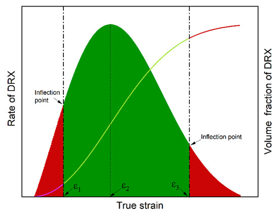 The strain in Equation (28) corresponds to two inflection points of the transform velocity of DRX, the range of which includes the strain corresponding to the maximum velocity of DRX. Thus, there are three key strains, which are rewritten as: