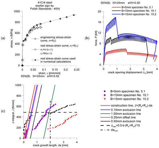 (a) The engineering and real tensile curve of 41Cr4 steel, prepared for the needs of numerical FEM calculations [6]. (b) Selected diagrams of force, P, as a function of crack mouth displacement, δM, for steel 41Cr4, recorded using SEN(B) specimens [5,6]. (c) The J-R curves obtained while determining the fracture toughness of 41Cr4 steel—selected results [5,6].