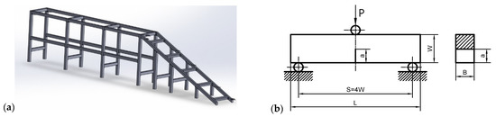 (a) Model of the fragment of inroad for cars that has been damaged and for which the research material is presented in [5,6]. (b) Geometry of the SEN(B) specimen, which was used in the fracture toughness tests [5,6]: W—specimen width (W = 25 mm), B—specimen thickness (B = {5, 10, 15)} mm), a—crack length (a/W = 0.50), S—support spacing, L—total length of the specimen (L = 120 mm).