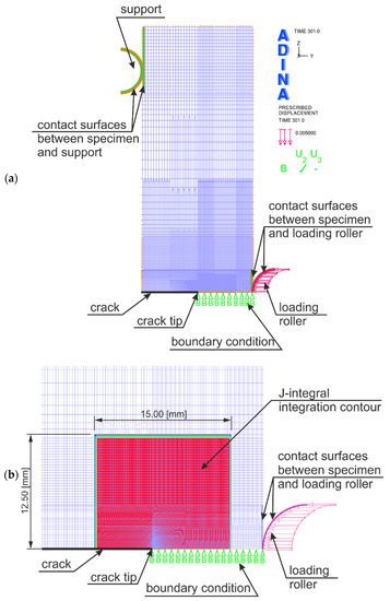 Numerical model of the SEN(B) specimen used in numerical calculations simulating the crack growth: (a) model of the whole specimen, and (b) enlargement of the area at the top of the crack, along with the designation of the integration contour required for the numerical estimate of the value of the J-integral.