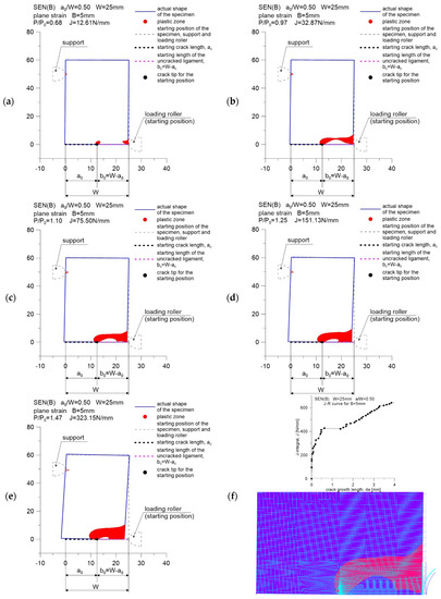 Change in the size of the plastic zone for the SEN(B) specimen, made of 41Cr4 steel, with a thickness of B = 5 mm. Specimen number in Table 1: 5.1: (a) results for P/P0 = 0.68 and J-integral J = 12.61 N/m; (b) results for P/P0 = 0.97 and J-integral J = 32.87 N/m; (c) results for P/P0 = 1.10 and J-integral J = 75.50 N/m; (d) results for P/P0 = 1.25 and J-integral J = 151.13 N/m; (e) results for P/P0 = 1.47 and J-integral J = 323.15 N/m; (f) the J-R curve for specimen and the shape of plastic zone for last point from J-R curve.