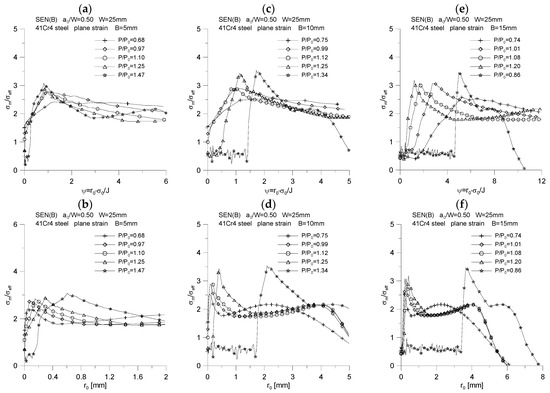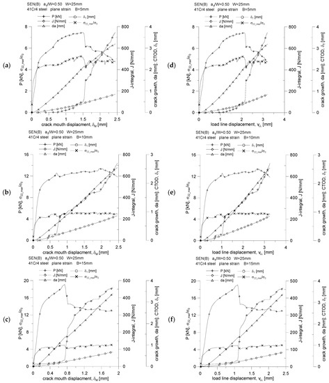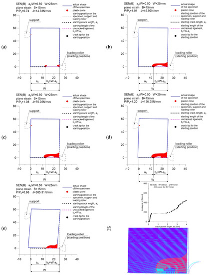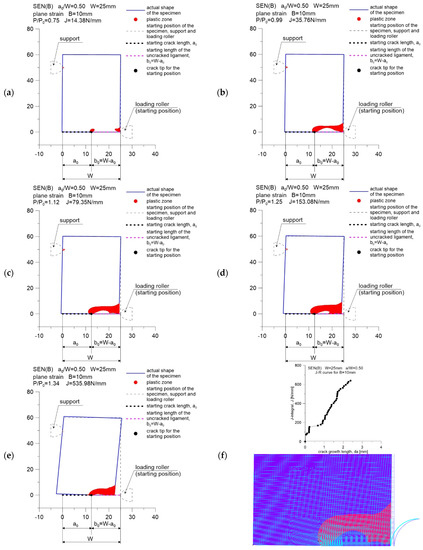 Figures marked as (a–e) were made with the use of data in the GRAPHER program, while Figures marked as (f) show the plastic zone drawn during postprocessing, using the ADINA environment, for the moment when the value of the J-integral was about 75 N mm. This value, as suggested in [5,6], can be treated as a material feature—a measure of the fracture toughness in a plane strain state domination, assuming that its determination is based on the guidelines in [2]. As can be seen, the plastic zone increases with increasing external load. This phenomenon is observed for all specimens considered in the study.