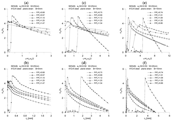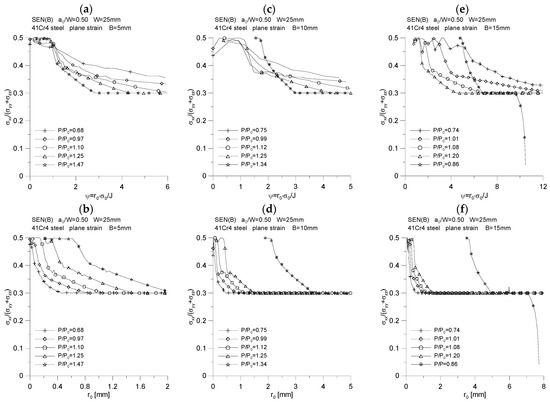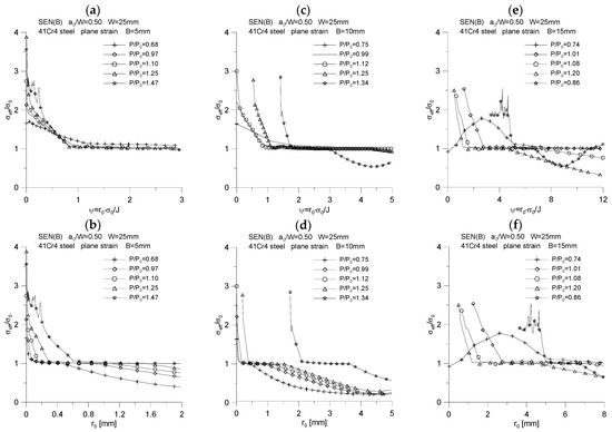 Distribution of the quotient σm/σeff for three specimens used in the crack propagation simulation. The graphs (a,c,e) were made for the normalized distance from the crack tip, ψ = r0·σ0/J, while the graphs (b,d,f) were prepared for the physical distance from the initial crack tip position, r0. The figures show the distributions for the characteristic moments provided in Table 2.