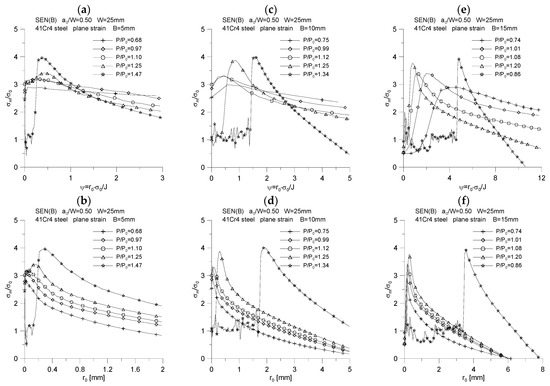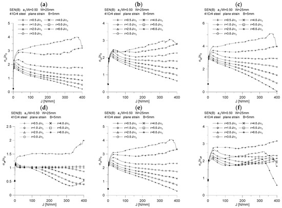 The changes of the above-mentioned quantities were plotted as a function of the normalized distance from the crack tip, calculated as ψ = r0·σ0/J, and as a function of the distance from the initial position of the crack tip, designated as r0. The results of the analysis are presented in Figure 7, Figure 8, Figure 9, Figure 10 and Figure 11.