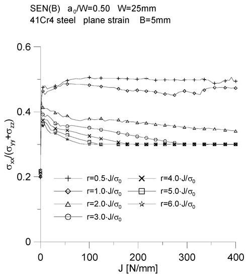 Figure 12, for one of the geometries considered in the study (specimen with a thickness of B = 5 mm), shows how the levels of the principal components of the stress tensor, effective stresses and mean stresses change at different normalized points near the crack tip, depending on the external load expressed by the J-integral value. It should be noted that the standardized position in front of the crack tip, marked with ψ, was determined in relation to the initial physical location of the crack tip. Along with moving away from the crack tip, a decrease in the level of the main components of the stress tensor and the mean stresses, σm/σ0, is observed. In the very close vicinity of the crack tip for ψ∈⟨0.5, 1.0⟩, an increase in the values of the main components of the stress tensor and mean stresses is observed. Moreover, for ψ = 0.5, an almost constant value of effective stresses can be noticed, at the level of σeff = 1.5·σ0, which, at the moment of increasing the crack length by about 0.2 mm, significantly increases to the level of σeff = 2.0·σ0. Within the normalized distances from the initial position of the crack tip, ψ∈⟨1.0, 3.0⟩, effective stresses until the crack length increases by 0.2 mm are practically constant and equal to the yield point. For further normalized distances from the crack tip, the level of effective stresses drops even below the yield point with increasing external load. The reader is left here to draw detailed conclusions from the analysis of Figure 12d, as well as to evaluate the curves shown in Figure 12f, which presents for a specimen with a thickness of B = 5 mm changes in the quotient for seven selected normalized distances from the crack tip, with increasing external load, expressed by the J-integral value.