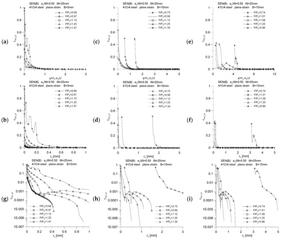 During the numerical calculations, the level of accumulated plastic strains near the crack tip was also assessed for the characteristic moments presented in Table 2 (Figure 14). The level of accumulated plastic strains and their distribution in front of the crack tip depends to a large extent on the specimen thickness and the external load, which for different geometries is accompanied by a different increase in the crack length. The analysis of the distributions presented in Figure 14, combined with the assessment of the developing plastic zones, shows that in the area 1 mm from the crack tip, we are dealing with significant plastic deformations, regardless of the thickness of the specimen. To illustrate the proper level of accumulated plastic strains, in Figure 14h,i, the ordinate has a logarithmic scale. The conclusions drawn from these three additional graphs, based on their analysis and an overview of the developing plastic zones (Figure 4, Figure 5 and Figure 6), are left to the reader.